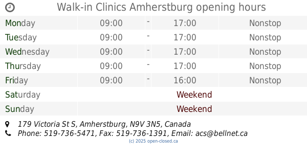 It is also possible to : Edit these OPENING HOURS of Store Walk-in Clinics In Amherstburg, 179 Victoria St S,